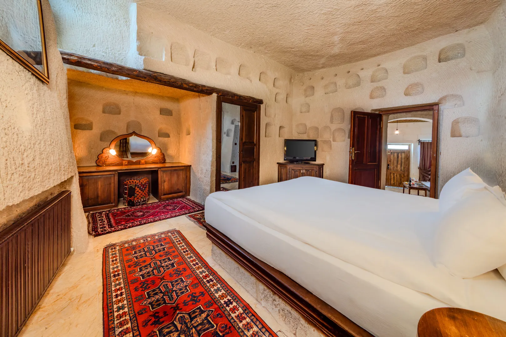 您会在所有浴室和其他一些房间的天花板上看到开凿的孔。这些孔增加了洞穴表面所需的空气循环。没有通风会导致潮湿积聚,墙壁和天花板会受损。